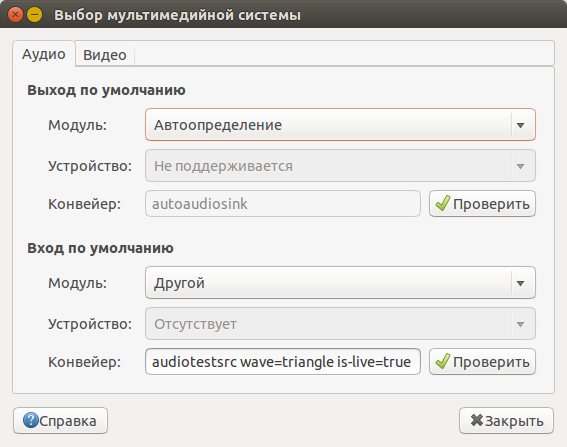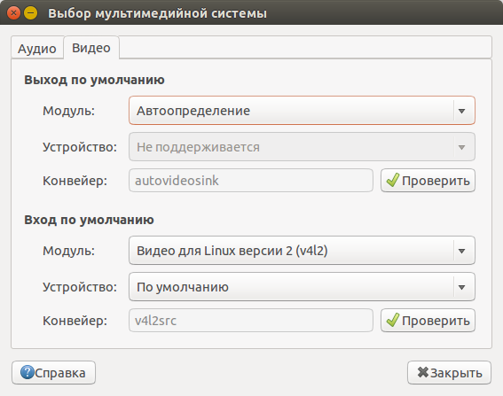 Как видно на снимках, приложение Выбор мультимедийной системы имеет две необходимые вкладки: Аудио и Видео. В каждой из вкладок есть проверочные кнопки - Проверить. Вы можете проверить работу Аудио и Видео, нажав на эти кнопки. Если какие-то параметры не работают корректно, их можно изменить на своё усмотрение в значении Модуль и вновь нажать кнопку Проверить, добившись нужного результата.