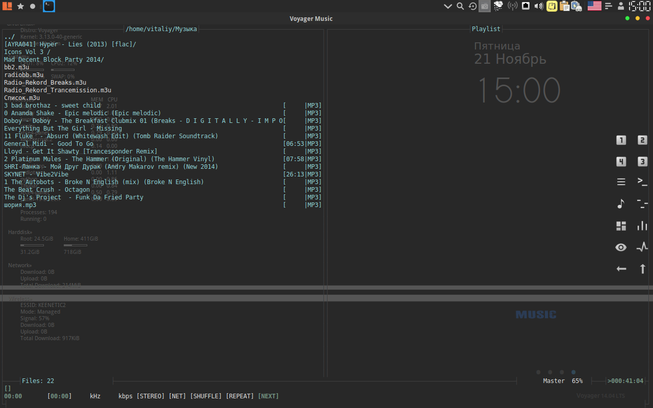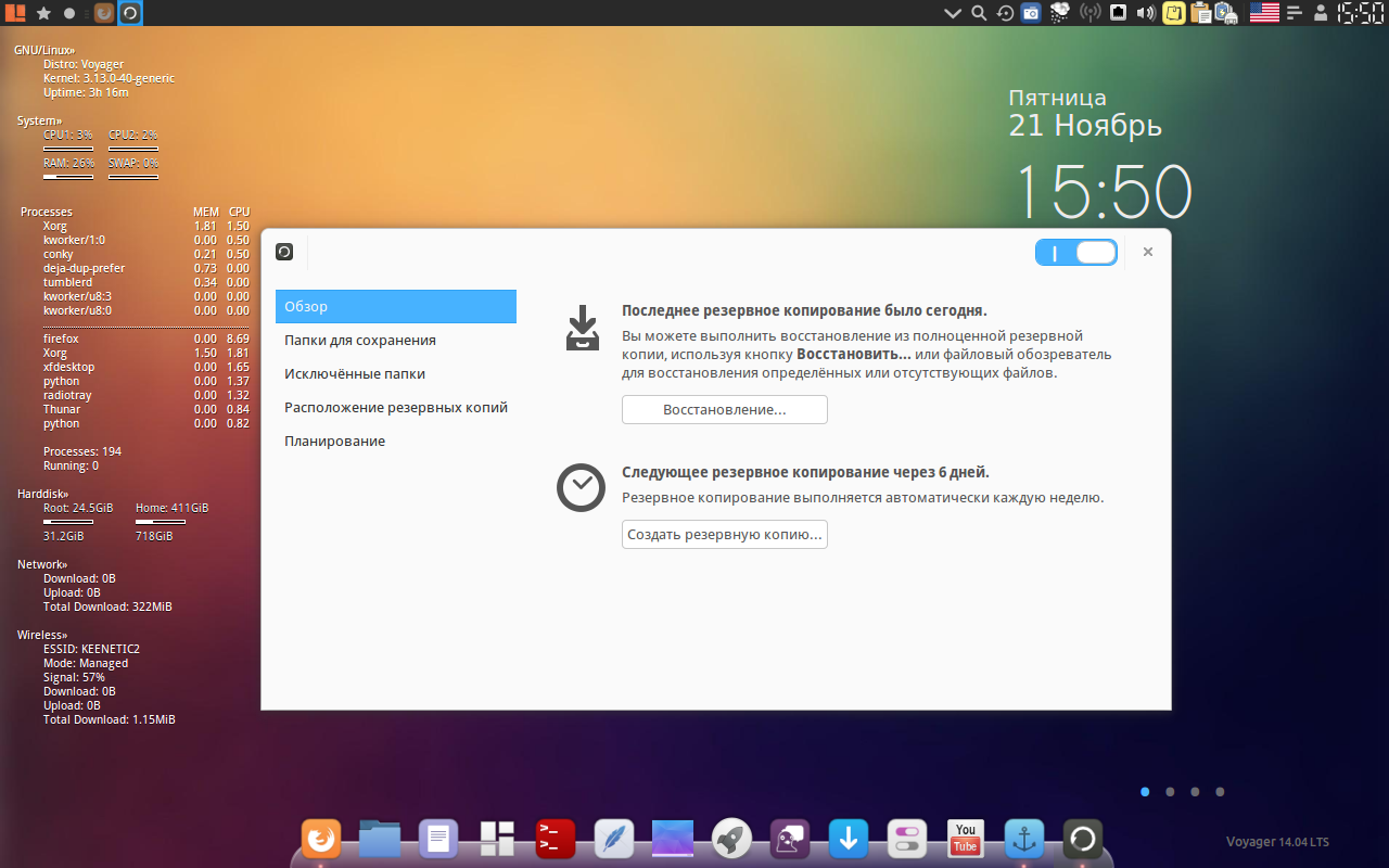 Кроме того порадовала лёгкая настройка самого xfce. Очень удобный трей, дополнения в виде погоды. Автор сборки установил программу для интернет радио и интересную кнопку (что то в виде органайзера по функции) при нажатии на которую запускается календарь (с листом напоминаний), заметки, калькулятор и cryptkeeper. Неожиданно функционально!