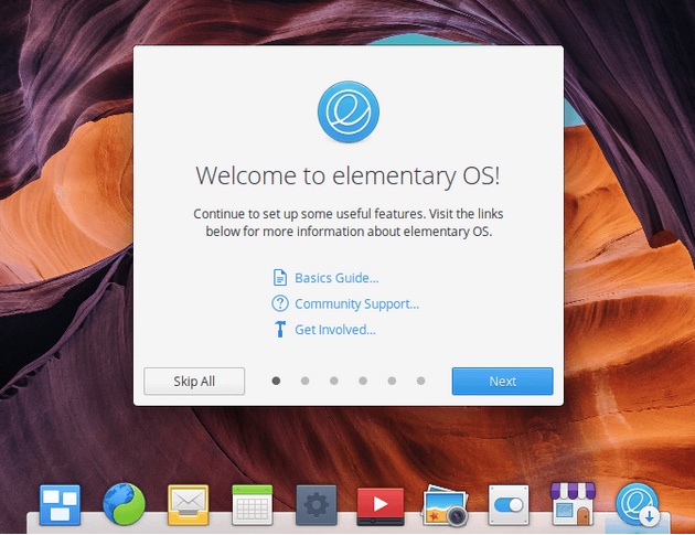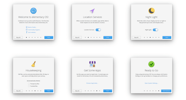 Окно Onboarding появляется при первой загрузке системы, после установки и после создания нового пользователя. Интерфейс первоначальной настройки позволяет настроить такие опции как: Сервисы местоположения, Ночной режим, Очистка, открытие Центра приложений AppCenter, для установки дополнительных программ.