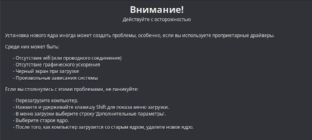 Предупреждение. Ядро Linux является критичным элементом системы. Обновления ядра могут содержать улучшения аппаратной поддержки или устранять уязвимости. Делать обновление стоит когда одно из аппаратных устройств работает некорректно, а новое ядро может решить данную проблему. Но в тоже время установка нового ядра без особой необходимости может привести к нежелательным регрессиям, таким как: отсутствие подключения к сети, отсутствие звука или даже невозможность загрузить систему, поэтому устанавливайте новое ядро на свой страх и риск.