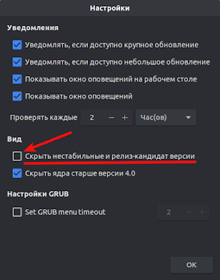По окончании установки запустите утилиту Ukuu из системного меню, зайдите в Настройки и снимите флажок с параметра Скрыть нестабильные и релиз-кандидат версии: