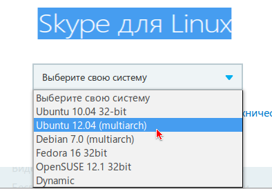 А затем перейдите на официальный сайт по следующей ссылке: http://www.skype.com/ru/download-skype/skype-for-computer/ и выберите Ubuntu 12.04 (multiarch), как показано на снимке: