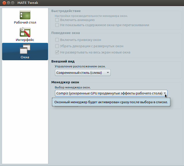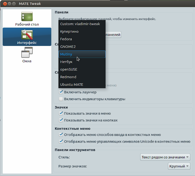 В MATE Tweak можно выбрать и переключить окружение рабочего стола из предложенного перечня на лету, т.е. без перезагрузки системы: