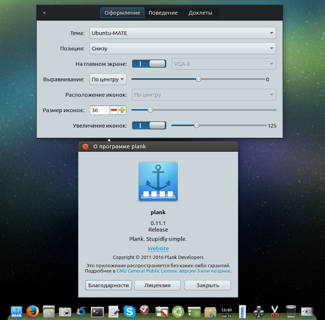 Док-панель Plank был обновлен до версии 0.11, в котором добавлены Доклеты и новая тема Ubuntu-MATE, в конфигурации панелей Купертино: