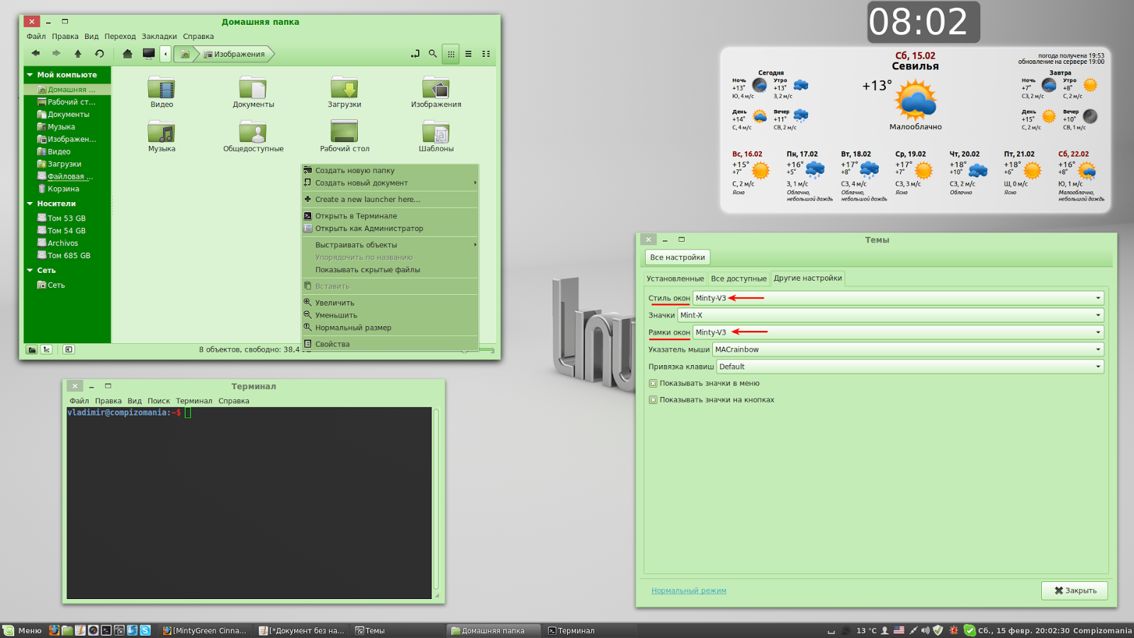 Вот как тема MintyGreen выглядит в Linux Mint 16 (Cinnamon) на моём компьютере: