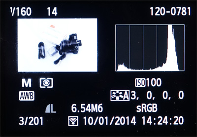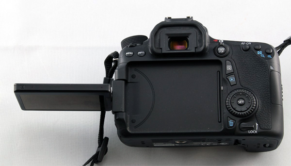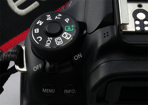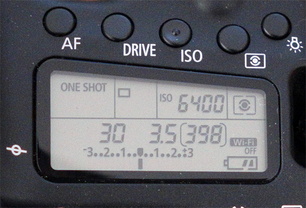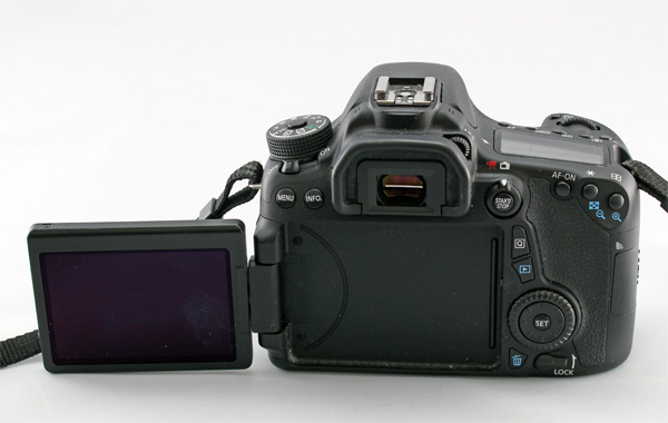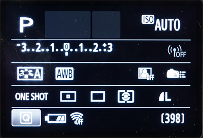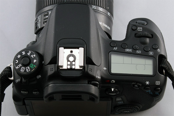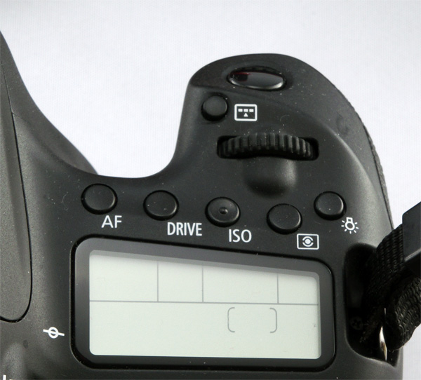 Здесь, разумеется, присутствует второй дисплей - маленький ЖК-дисплей с подсветкой. Такой дисплей - одна из главных особенностей современных зеркальных камер, и отсутствует он только у совсем младших моделей вроде 100D. Надо сказать, что этот дисплей - штука очень полезная (особенно для тех любителей, которые понимают значение слов ISO, выдержка, диафрагма, режим съемки, метод экспозамера), так как позволяет посмотреть значение выставленных параметров, не поднося к глазам видоискатель или большой дисплей.