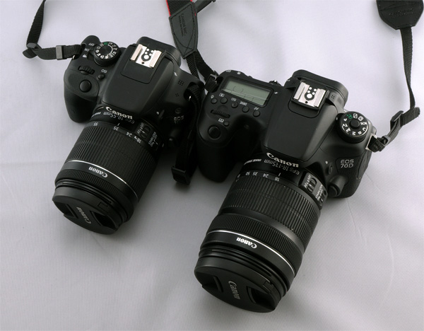 Ну и поставим рядом Canon EOS 100D и Canon EOS 70D - просто чтобы сравнить размеры тушек, так как объективы у них разные (у 100D - 18-55 мм).