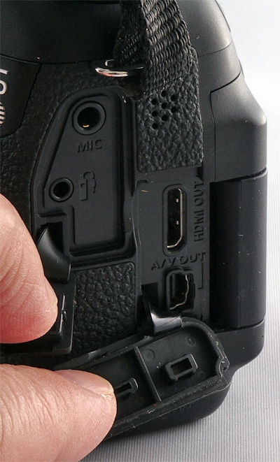 На левой грани под двумя резиновыми защитными крышками: выход для внешнего микрофона, выход для дистанционного управления, выход HDMI и выход аудио и видео.