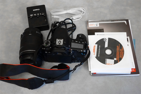 А внутри: фотоаппарат, объектив, зарядное устройство LC-E6E с кабелем, широкий ремень, интерфейсный кабель для подключения через USB, наглазник, брошюры, диск с программным обеспечением.