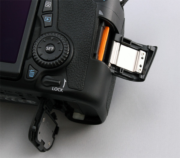 Слот под SD-карту находится под отдельной крышкой на правой грани, над слотом расположен индикатор записи данных на карту. Отсек с крышкой под аккумулятор традиционно расположен справа на нижней грани корпуса. (Напомню, что в EOS 100D слот под карту памяти расположен рядом с аккумулятором, что заметно неудобнее для использования.)